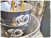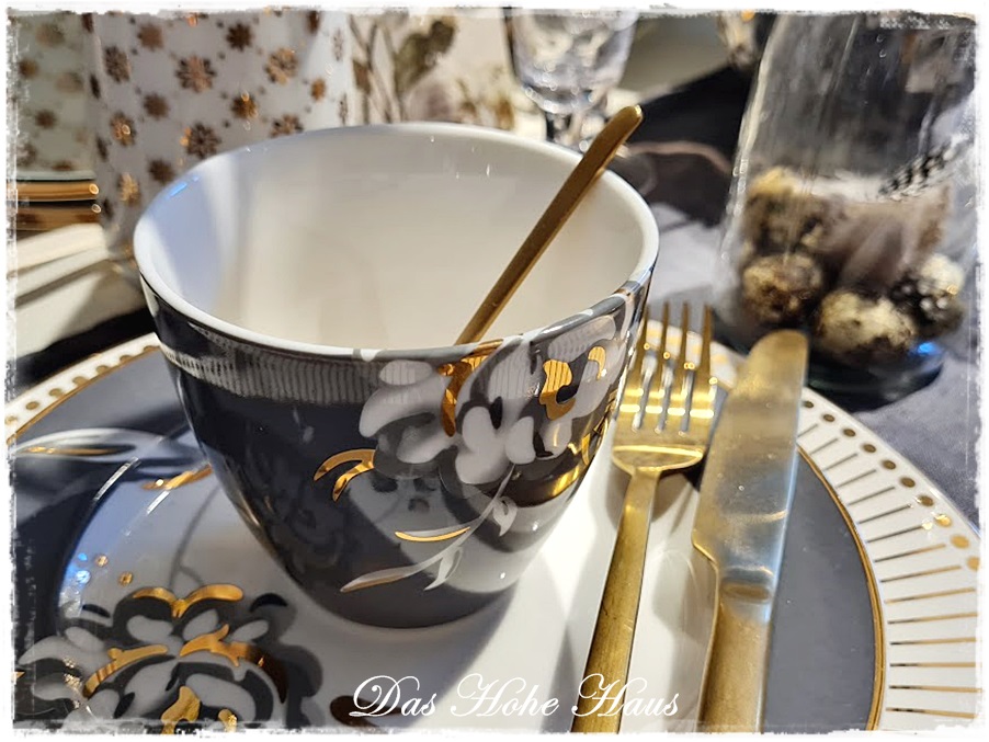 Edler Latte Becher Aslaug in gold und dunkelgrau mit Blumen von Greengate, Porzellan, Höhe 9cm